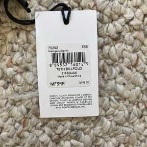 Mahogany with denim accent trim and inside. Glovetanned leather. Open front pocket, zippered inside pocket, 8 card slots and 2 slip pockets.