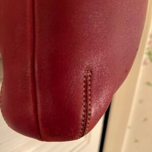 This is a bag that has been places and done things and has the marks of well-loved leather to prove it. The Coach-signature lined interior is like new and features two open pockets and a zipped pocket. The back has the hallmark scratches of real aged leather. The hang-tag is original to the bag, but the chain is a replacement when the original broke. Strap can be doubled for use as a shoulder bag. I've loved this bag, and I think you will, too.