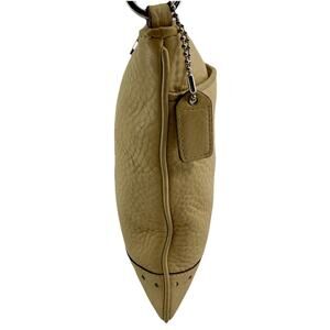 Made with supple beige pebbled leather and silver hardware. Features a full zip closure, long adjustable strap, and spacious fabric-lined interior with Coach signature print.
