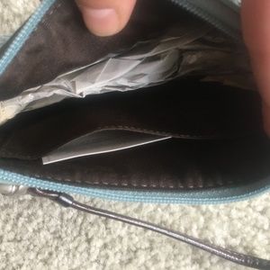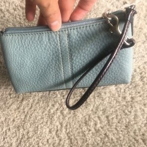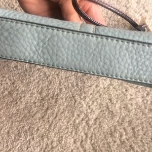Leather beautiful powder blue wristlet with brown leather strap. New!