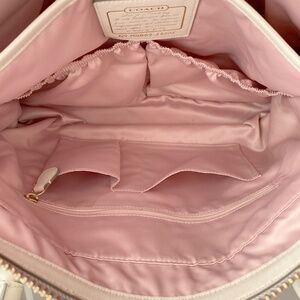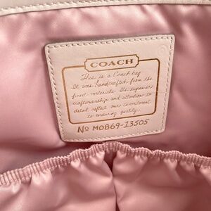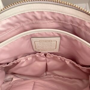 Large Coach weekender travel bag. Very glam, quiet luxury. Genuine leather with a pearlized ivory finish gives bag a gorgeous subtle sheen. Gold tone hardware, luxe pink satin interior. Very good pre-owned condition! Slight cracking on edge of one strap. Some tiny marks on bag, see photos.