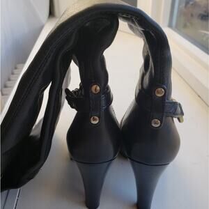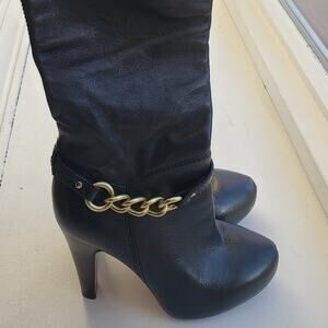 Pebble leather over the knee boots with chain detail. Boots can be cuffed as shown in last pic. In like new condition. Size 6. Approx 4" heel platform 1/2" approx shaft 17" (uncuffed)