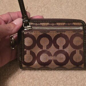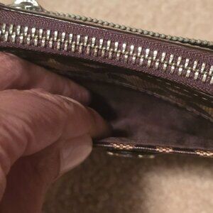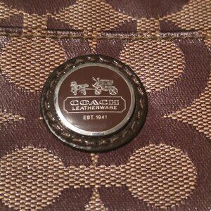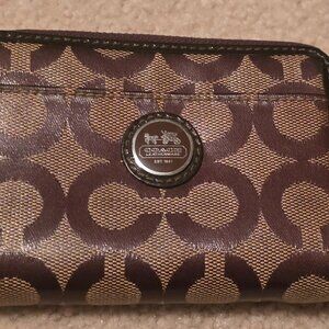 Coach Alex Signature Brown C Logo Medium Zip Around Wallet 43382 SVKH. Tan & Brown Patent Fabric has been coated and the pulls and edging is patent leather. GUC! Inside the paper bill fold area, the fabric has come unstitched from the top-as seen in pictures. Useable and not noticeable.