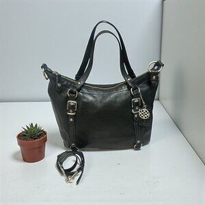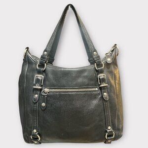 • Exterior: Soft black leather with silver nickel hardware accents; Detachable shoulder strap; Dual top handles; Zip-top closure; Nickel studs and buckles; Original hang tags