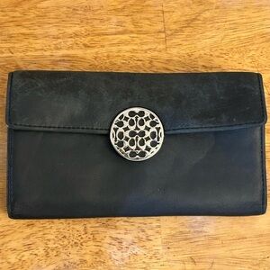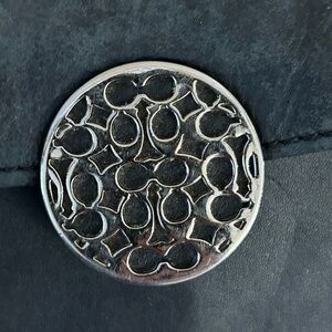 • Features: A round, silver-toned snap closure with the Coach signature pattern.