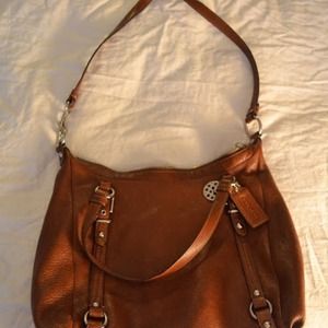 This is a beautiful and functional large brown pebbled leather bag in great condition. It has a small zip pocket on the inside and another zip pocket on the outside back. Love love this bag as it is truly a great quality piece that's highly versatile. If I don't get the price I want for it I'll just keep it.