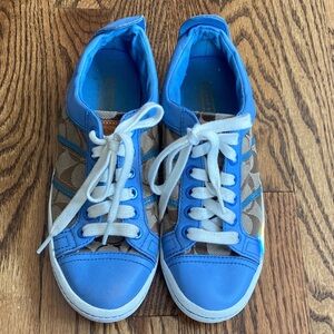 Coach Alivia sneakers, size 7.5. Classic coach fabric with blue details. A couple small areas of scuffing, otherwise excellent condition. Narrow width, tie laces. Ships quickly from smoke free/pet friendly home.