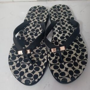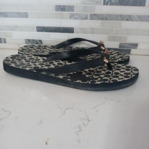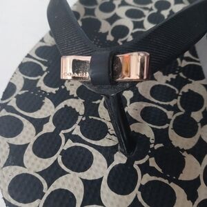 COACH AMEL SIGNATURE ALL OVER LOGO THONG FLIP FLOP COMFORT SANDALS WITH GOLDEN BOW WITH LOGO AT TOES. SOME WEAR ON INSOLE OTHERWISE GREAT CONDITION.