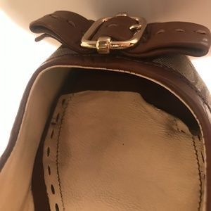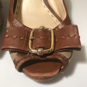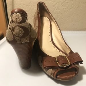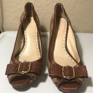 Coach Andi Wedges. Shoe says a size 8, but I am a pretty standard 8 and they are too big (heels do not reach the backs, width is good). Would fit an 8 1/2 or a 9. Signs of wear. Front toe leather shoes signs of wear, leather foot bed has some slight rising where toes rest (see photos). I can have the slight rising on the foot bed re-glued IF REQUESTED.