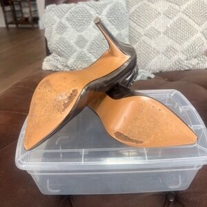 Coach high stiletto heels with ankle straps. Beautiful silver leather. Slight wear bottom of shoes as shown in photo. Size 8.5