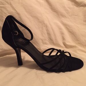 Black suede dress sandals. Stiletto heel is 3". Never been worn.