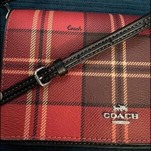 Coach Anna Foldover Clutch Crossbody Red Black Tartan Plaid Print