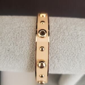 Coach bangle is apricot/beige enamel over gold plate base. Has grommets with the coach logo. Pre-owned and shows minor signs of wear.