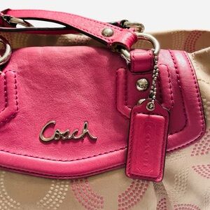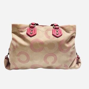 Coach #F20019-khaki and hot pink leather-signature C optic canvas tote/satchel