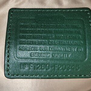 •Coach script signature on the front of bag, 3-compartment beige satin interior with zipper compartment in the center.