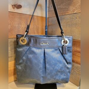 Excellent pre owned condition Coach Ashley medium Signature "C" pattern in charcoal/slate. This has a deep denim feel to me. The signature C's have a slight shimmer. Leather trim, removable crossbody strap, contrasting silver hardware. Exterior has one tiny spot on the bottom(pictured), otherwise spotless. Interior features eggplant color satin, 2 slip pockets and 1 zip pocket. Original hangtag ! This bag has been cleaned inside and out using only the finest materials.