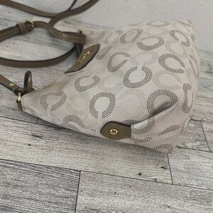 Coach Ashley Op C Crossbody Bag. Stylish Coach crossbody with signature pattern. Cream and brown design. Perfect for daily use. Canvas bag with patent leather trim. Very good overall condition. Needs a little cleanings. See all photos. Measures 9” x 6” x 3” with an adjustable strap.