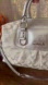 Medium sized, this zipper top satchel has double handles and a shoulder strap, which can secure on the bottom of the bag if desired! Constructed with Coach’s beautiful metallic silver leather and paired with the classic signature C’s in silver! She has her beautiful original silver hang tag! Made in November 2011.