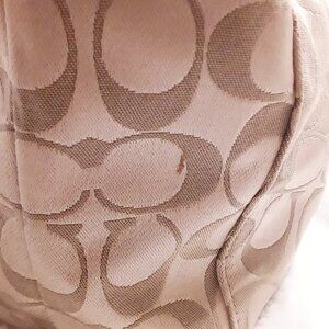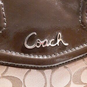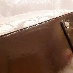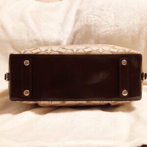 Made by Coach, it's their Ashley Signature Satchel Handbag, brown edition. Lightly used, has small scratch in front, small mark on side and in front, and light scuff on bottom, all shown in photos, but is otherwise in like new condition. Photo of authenticity patch included in last photo.