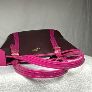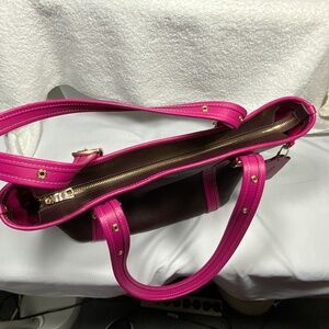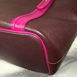 * Pebbled dark maroon leather (I think the color is called Oxblood) with pink smooth leather handles and trim