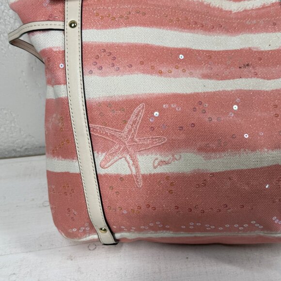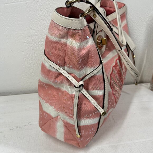Coach Audrey Cinched Tote Pink Stripe Canvas Shell Motif Sequin Leather Trim