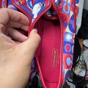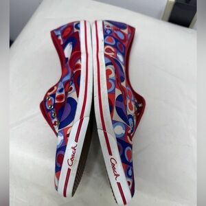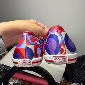 Coach Signature Sneakers, women's size 8.5. These vibrant multicolor low-top sneakers feature the iconic Coach C logo in a geometric pattern of red, blue, purple, and white. They have a classic lace-up design with gold-tone eyelets and comfortable red interiors. The rubber soles are marked "Coach EST. 1941". These stylish shoes are perfect for adding a pop of color to any casual outfit and are in excellent pre-owned condition with no stains or holes. Some discoloration to the white midsole. Should magic eraser off. No other noted flaws. Can add laces if you choose, none provided.