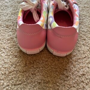 Coach Authentic "Barrett" Rainbow Monogram Print Pink and White Sneakers Size 7.5. Excellent pre-loved condition. I am happy to provide additional photos or specific measurements upon request.