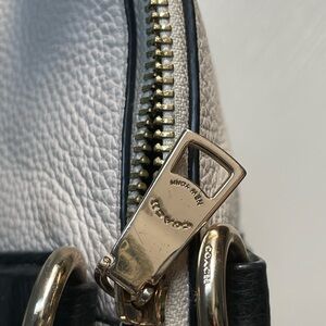 Chic Coach tote in ivory and black. Features sturdy handles and sleek design.