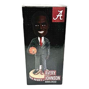 The product is a Coach Avery Johnson bobblehead representing the University of Alabama Crimson Tide basketball team. The bobblehead is designed in the team's colors of red and features Coach Avery Johnson, who is associated with the Alabama Crimson Tide basketball program. It is a collectible item that would appeal to fans of the team and basketball enthusiasts.