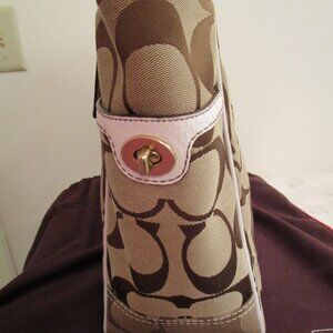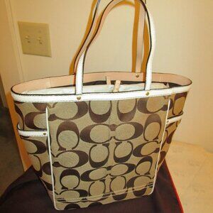 From the 2006 Season is this brand-new, never-used Coach Graphic/White Trim Fabric tote with a dog-leash type closure. This bag is strong enough for a few books and a small computer. It still has the original packing material. It comes with a dust bag but there are no protective feet. This does not have any kind of a shoulder strap. Inside is a vachetta-type leather trim. There is a big zip pocket and slip pockets as well. Always stored in a smoke-free, pet-free area. No odors. Notice the sides have small, turnlock closure pockets. This is another great everyday Coach bag. It measures 12 inches high by 10 inches wide with a 5 inch base width. The handles have a 7 inch drop.