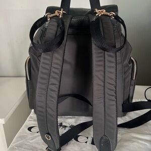 Elegant Coach backpack with gold accents. Features multiple zippered pockets. Ideal for organization and style.