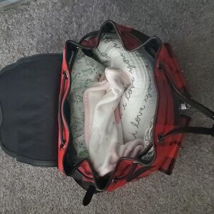 Coach Rucksack in Black & Red Buffalo Plaid, Coated Canvas w/Leather. Two front pockets w/turnlock, inside zip pocket, 2 slip pockets. Used as a diaper bag for 3 months, very roomy - held diapers, wipes, bottles, extra clothes.