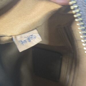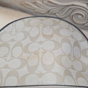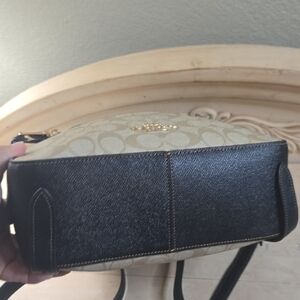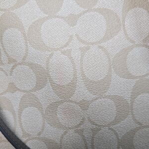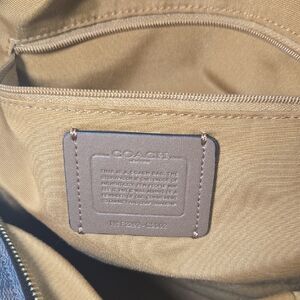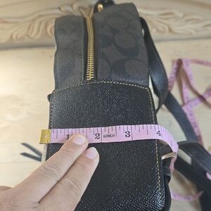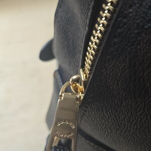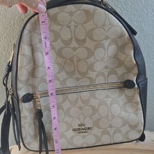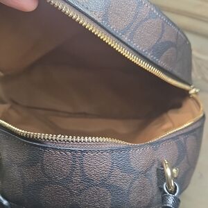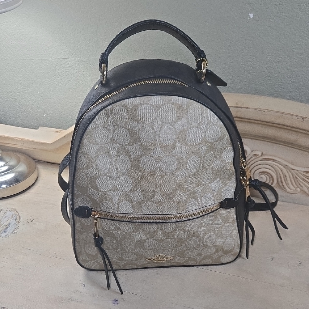 Elegant Coach backpack with signature pattern. Features black accents and gold hardware. Ideal for daily wear. It has some spots in the photos that appear