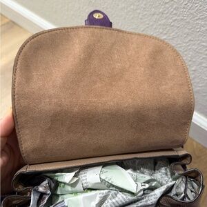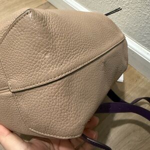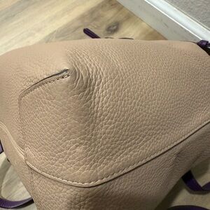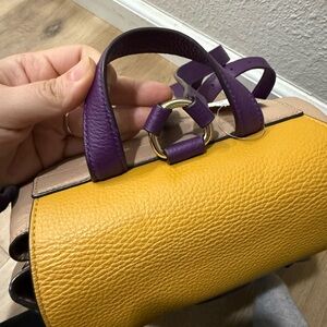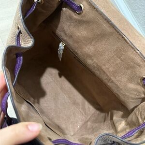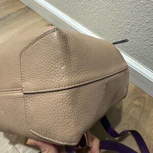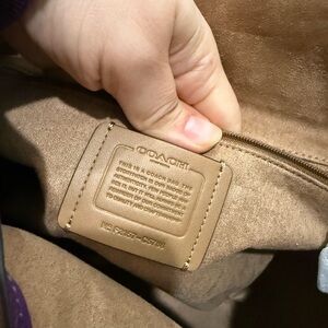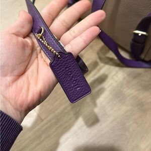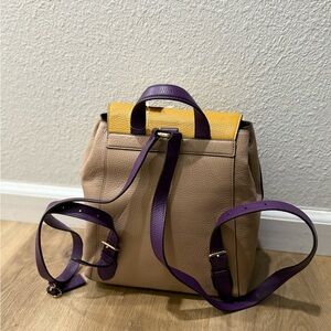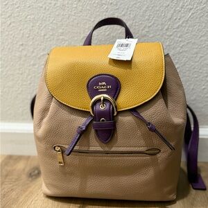 Elegant Coach backpack with tan, yellow and purple colors. Features striking purple accents. Ideal for daily use.