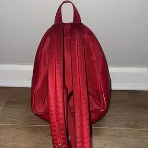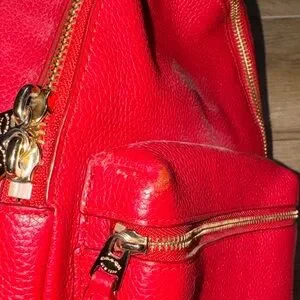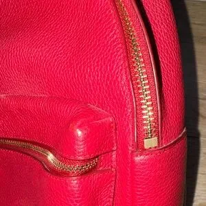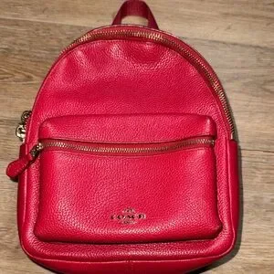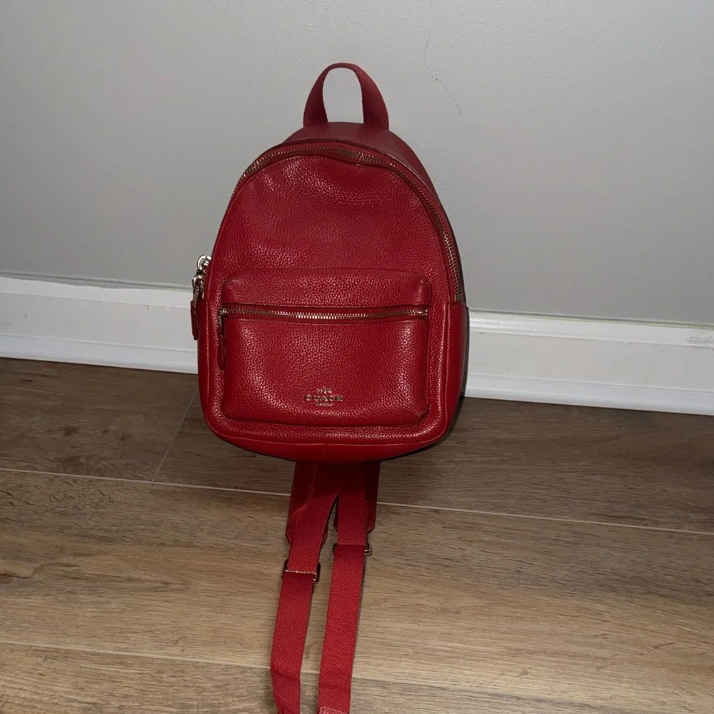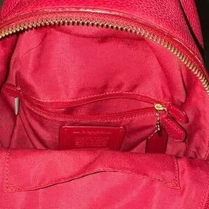 Stylish Coach red leather backpack perfect for everyday use. Features a sleek design with ample storage space. Some wear and tear on edges as shown. Good condition otherwise.