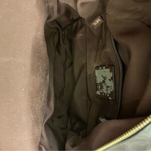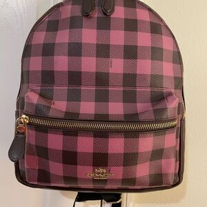 Coach mini backpack in pink and burgundy buffalo check coated canvas with burgundy leather trim and gold-tone hardware. Features front zip pocket, top zip closure, adjustable straps, and top handle. Good pre-owned condition. Interior creed patch shows peeling, but bag is fully functional and exterior presents well.