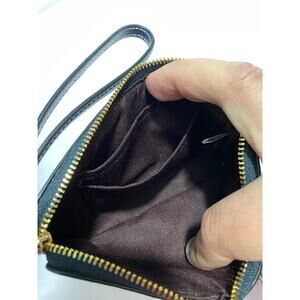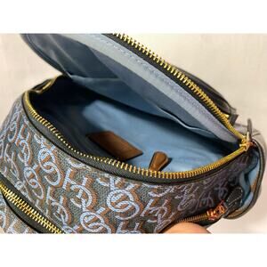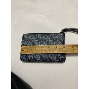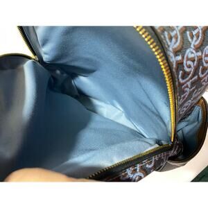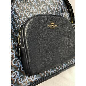 All-blue Coach backpack and matching wristlet featuring signature logo print throughout Backpack includes zip closure, front pocket, and light blue interior with zip compartment — sleek and functional Wristlet features zip closure and matching blue logo design — perfect for essentials or pairing with other blue Coach pieces Crafted with attention to detail — classic Coach branding and quality craftsmanship in a unified blue palette Multiple angles shown: full front/back, close-ups of blue fabric, label, and