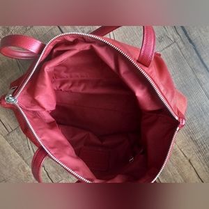 Red Coach shoulder bag. WOT. In good condition. Pls see pics has 2 pen marks on the inside of the purse above the right slide in pocket. Purse has 1 zipper on the inside & 1 on the outside, plus 2 slide in pockets inside. Measures 17" W. & 11 1/4" Tall.