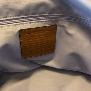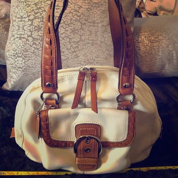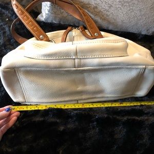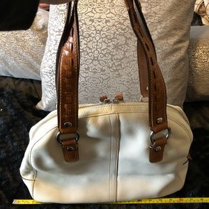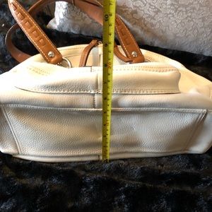 All leather. Off white and brown leather. Silver hardware. Very detailed leather straps. Beautiful bag. Excellent condition. Double zip opening. Big pocket on front with magnetic closure. Lavender lining.