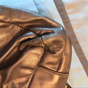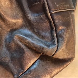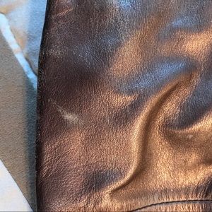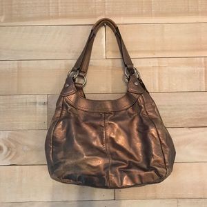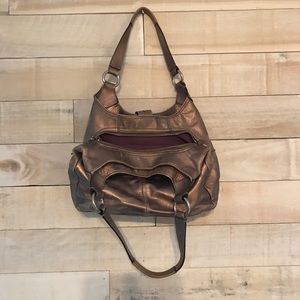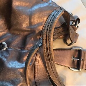 Well loved champagne metallic Coach bag with purple interior. This was my GO-TO bag for quite some time and it treated me so well! It's ready to go to a new home and has a lot of life left in it. It has three compartments (the middle one zips) and has an adorable purple interior. Imperfections pictured which are superficial only.