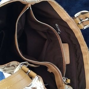 tan and brown coach bag and wallet. great shape . has lots of storage room. has 3 big pockets inside one has 2 small pockets center one zips closed to hold wallet and 3rd has small zipper inside also has few small barely noticeable blemishes small dirt mark on corner and wallet has small ink pen mark this bag is a 9 out of 10