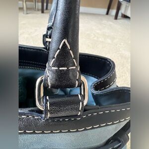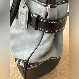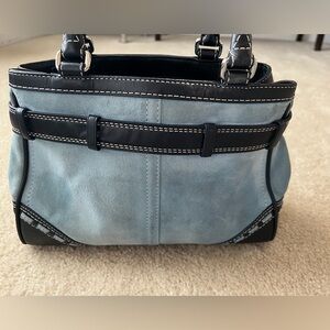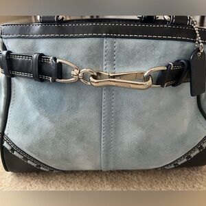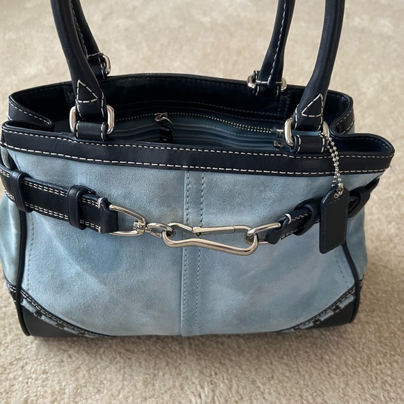 Used and shows sign of use coach bag. Suede and leather. Rubbing on each corner. Handle shown signs of use. Interior stain as shown in the picture. Any additional pictures please let me know. Please view all pictures carefully.