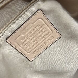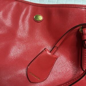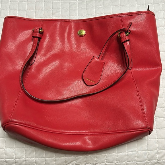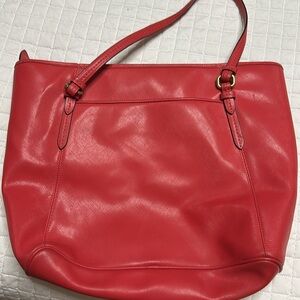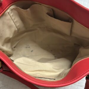Pretty poppy color. Outside is in great condition, but this purse has been used. Inside shows some markings from makeup and a pen.