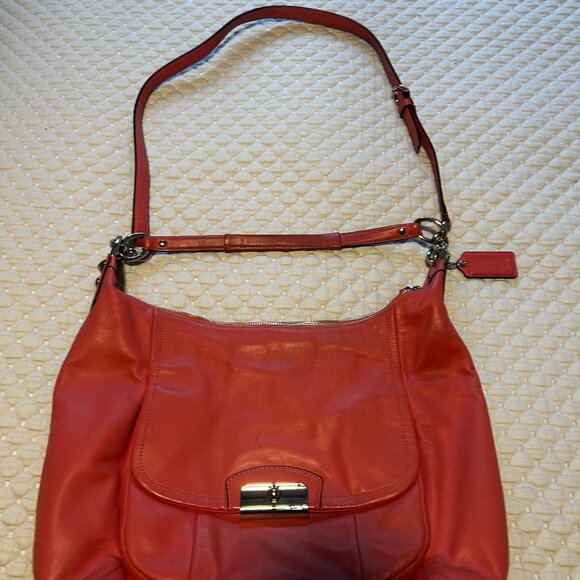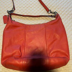 Coach Pink/Salmon color leather bag , can be worn as crossbody. Outside pocket. 3 inside compartments. Shoulder strap. WD 16" HGHT/Lgth 12-13". (FYI, there is no dark stain on the bag, just the shadow of the phone)