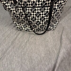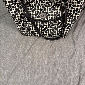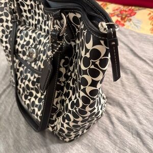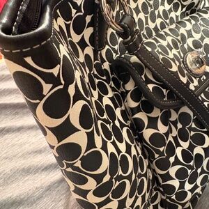 The coach bag is a nice signature bag with coach emblems all over it inside and outside. The bag has a large pocket on the front and one in the back and numerous pockets in the inside, there is a zipper closure on top. The bag is 15 inches wide and 9.5 inches long.