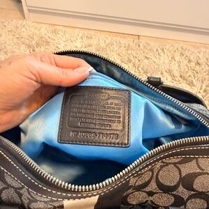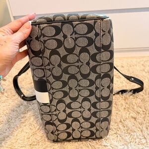 Authentic Coach signature canvas in classic black & beige with white stripe detail.