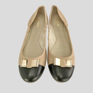 Coach Demi-Foldable Ballet slip-on flats in tan with black toe. Gold-tone bow detail at toe. Rubber soles. Original box included.