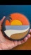 Made with a mineral blue crossgrain leather as the color, the front features a colorful orange, yellow, light and mineral blue, white and taupe/sand sunset beach scene appliqué.