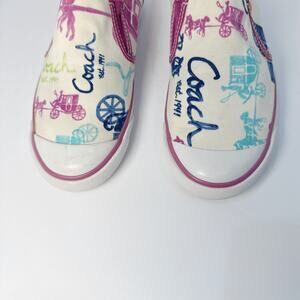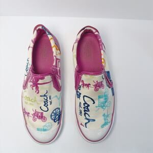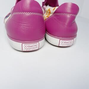 Step out in iconic style and comfort with these Coach Beale slip-on sneakers. Featuring the classic Signature "C" logo canvas upper and a smooth, bold purple fabric inner lining for a pop of color. The easy slip-on design and rubber sole make them perfect for casual, all-day wear. In excellent pre-owned condition, these shoes combine luxury with a laid-back, contemporary vibe.