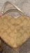 Heart-shaped crossbody with iconic pattern. Features a stylish gold chain strap.